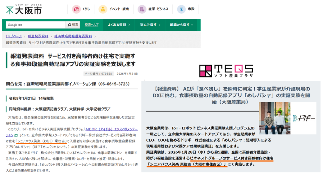 大阪市・大阪産業局TEQSと連携し、立命館大学の学生起業家が考案した「高齢者介護施設での食事量計測アプリ『めしパシャ』」の実証実験を行います。