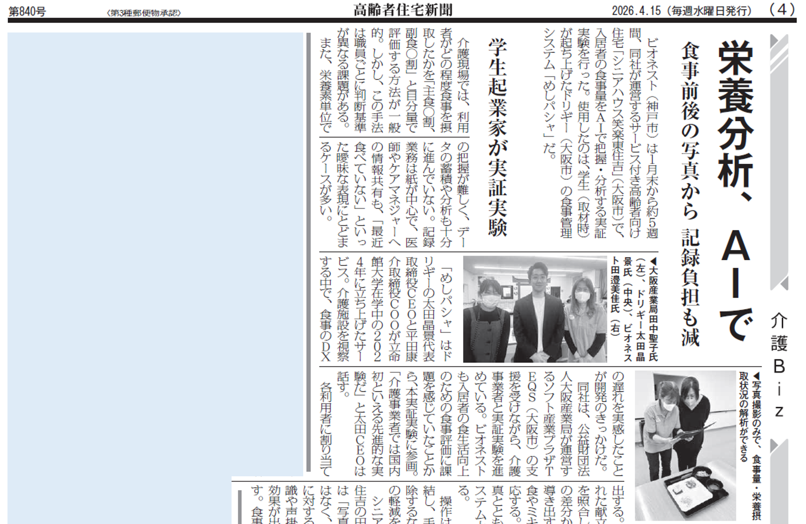 2026年1月下旬から約5週間に渡り、大阪市・大阪産業局TEQSと連携し、立命館大学の学生起業家(取材当時)が開発した「高齢者施設の食事量計測アプリ『めしパシャ』」の実証実験を行いました。
